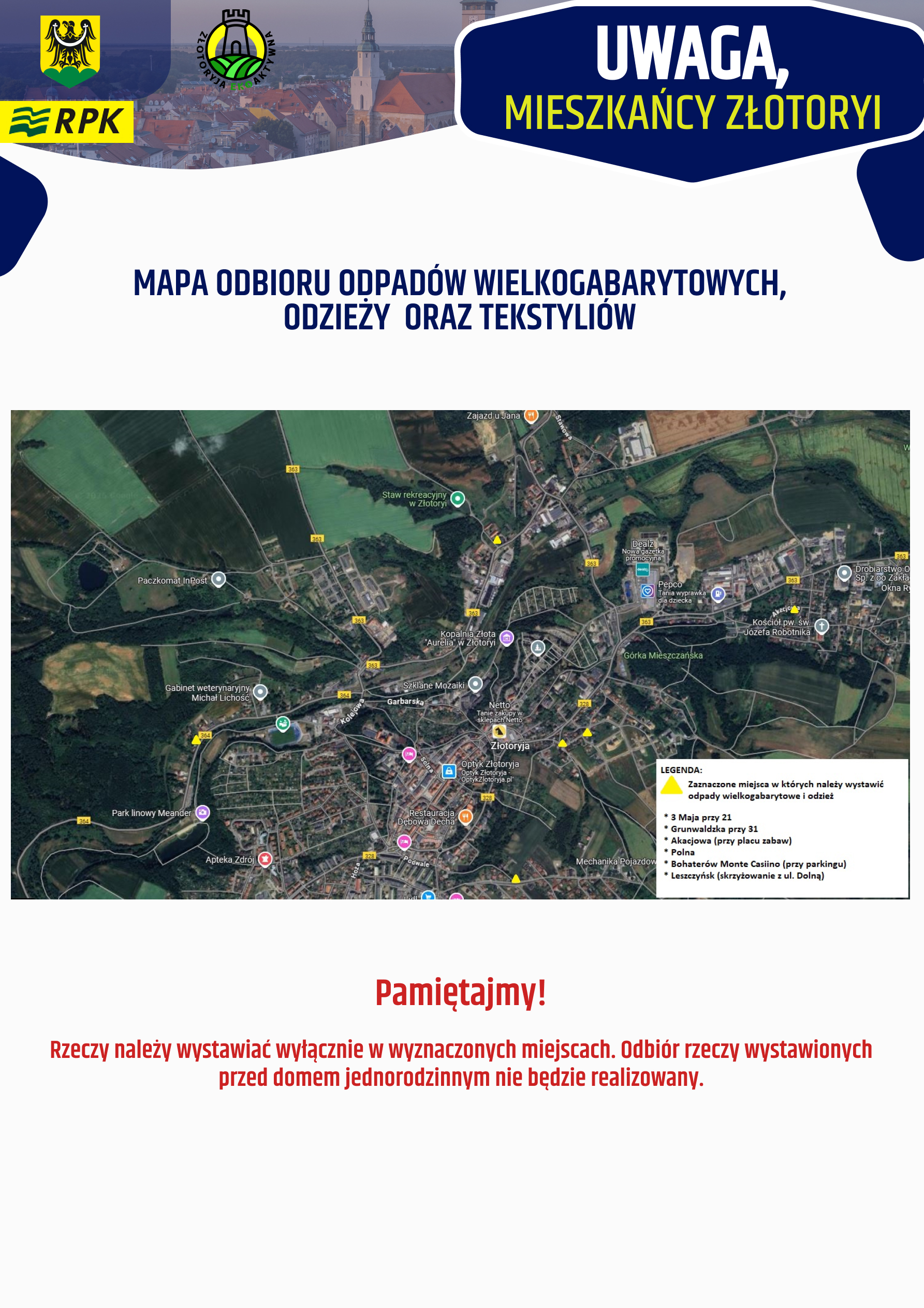 Prezentujemy także mapy punktów, w których mieszkańcy domów jednorodzinnych powinni zostawiać odpady i ubrania. Wystawianie ich przed posesje będzie potraktowane jako zaśmiecanie miasta.