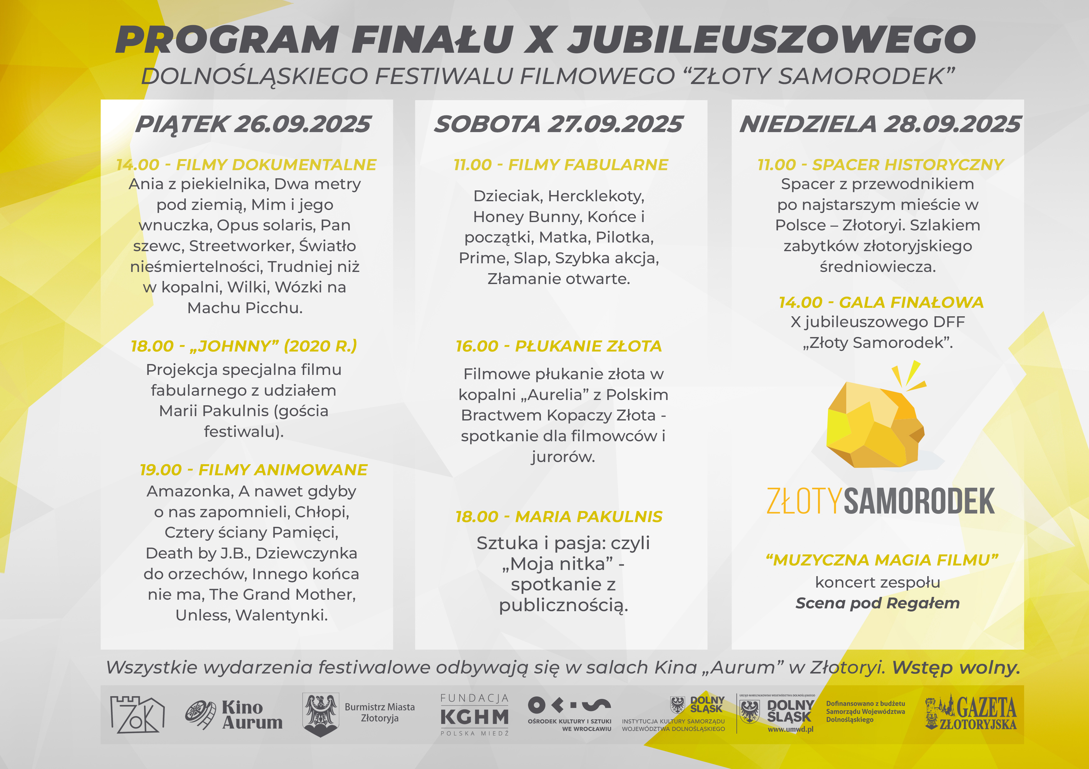 Maraton filmowy rusza w piątek 26 września o godz. 14. Na początek organizatorzy festiwalu zaprezentują 10 filmów dokumentalnych. Tego samego dnia o godz. 19 będzie można obejrzeć produkcje animowane. Na deser – w sobotę o godz. 11 – na ekranie kina Aurum pokazanych zostanie 10 filmów fabularnych. W jednym z nich („Szybka akcja”) zobaczymy pochodzącego ze Złotoryi aktora Krzysztofa Grabowskiego.