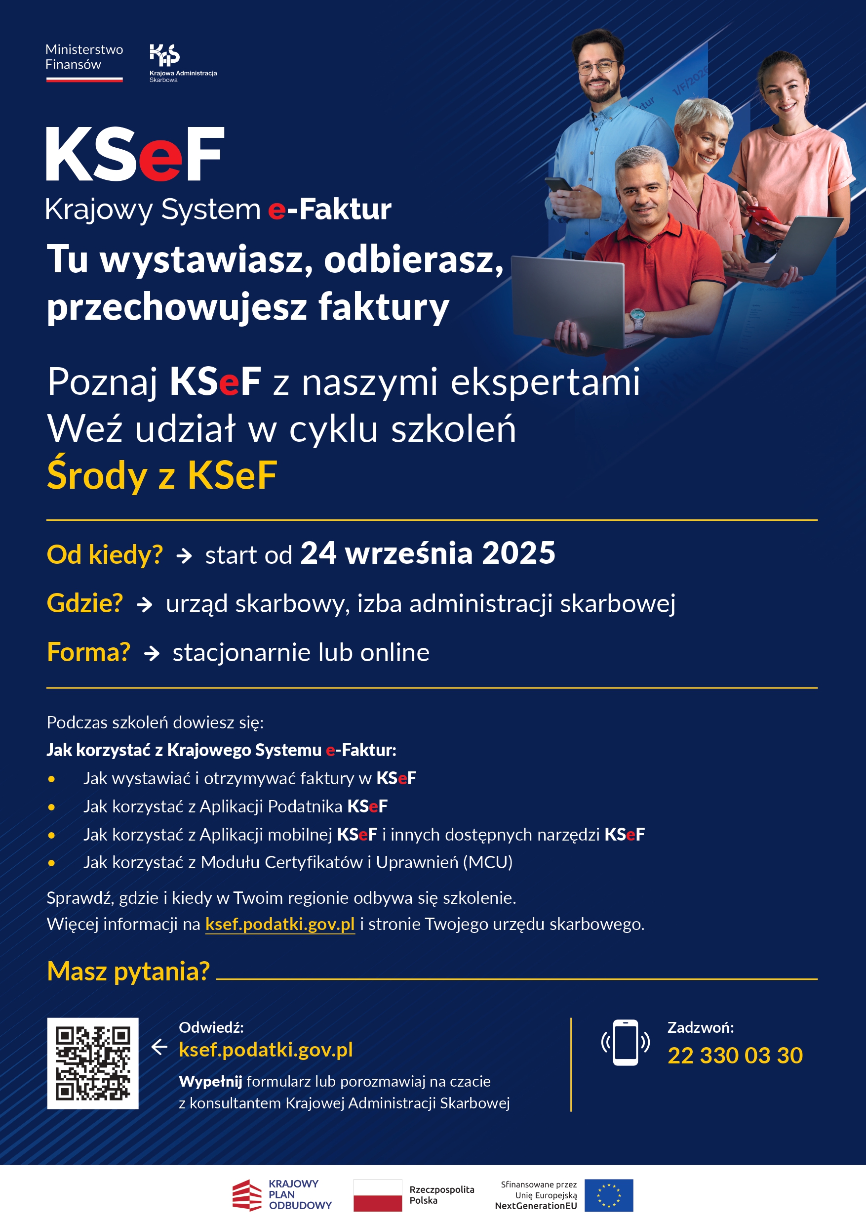„Środy z KSeF” to cykl bezpłatnych szkoleń, podczas których przedsiębiorcy mogą uzyskać podstawowe informacje oraz praktyczne aspekty korzystania z Krajowego Systemu e-Faktur. Spotkania odbywają się środy – zarówno stacjonarnie, jak i on-line, aby każdy mógł wziąć udział w dogodnej formie. Pierwsze ze spotkań w złotoryjskiej skarbówce rozpoczyna się już dziś.