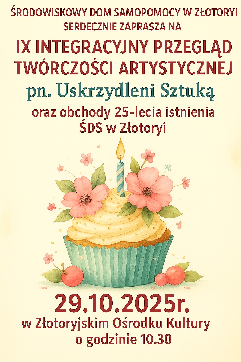 Uskrzydleni z jubileuszem w tleW środę, w Złotoryjskim Ośrodku Kultury, odbędzie się 9. edycja Integracyjnego Przeglądu Twórczości Artystycznej „Uskrzydleni Sztuką”. Wydarzenie będzie połączone z obchodami 25-lecia istnienia Środowiskowego Domu Samopomocy w Złotoryi.