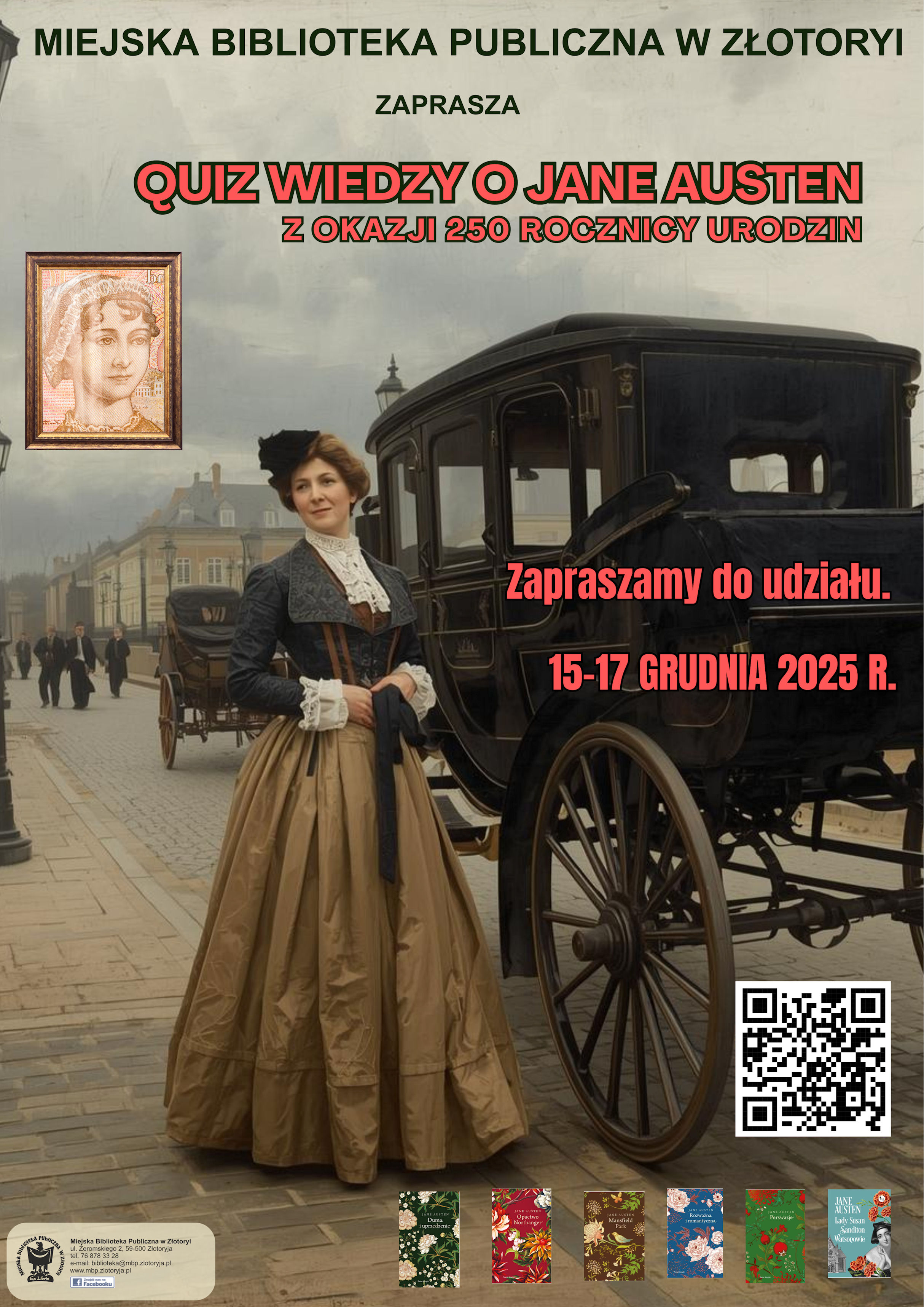 Z okazji 250. rocznicy urodzin Jane Austen, jednej z najwybitniejszych pisarek literatury światowej, Miejska Biblioteka Publiczna w Złotoryi zaprasza do udziału w quizie wiedzy poświęconym jej twórczości.