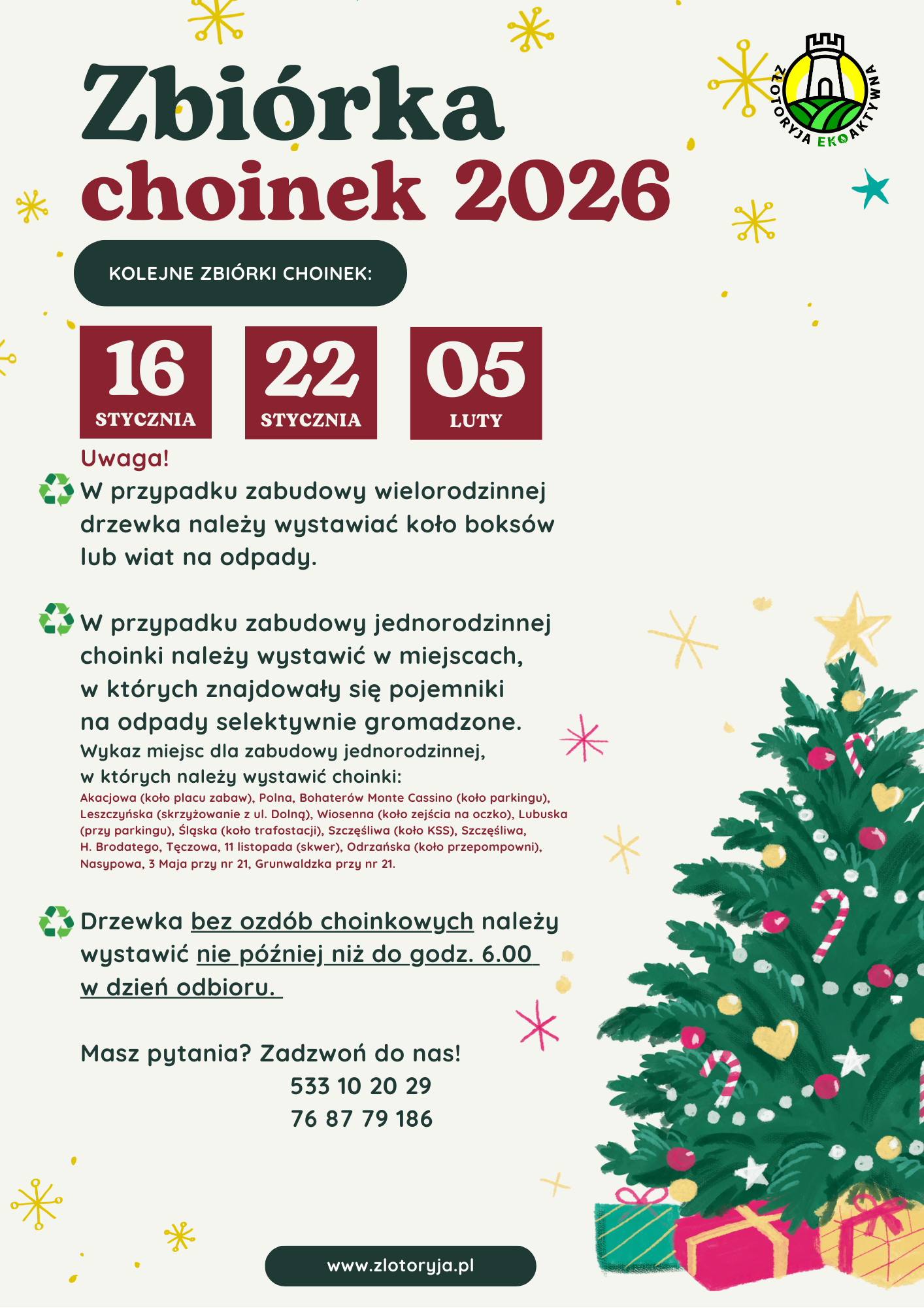 Przypomnijmy: choinki należy zostawić bez ozdób, lampek i folii. Wystawiamy je wieczorem w przeddzień odbioru lub do godz. 6 w dniu zbiórki. Gdzie? Przy miejskich boksach śmietnikowych lub w miejscach, gdzie dawniej zlokalizowane były tzw. gniazda do segregacji (na osiedlach domków jednorodzinnych).