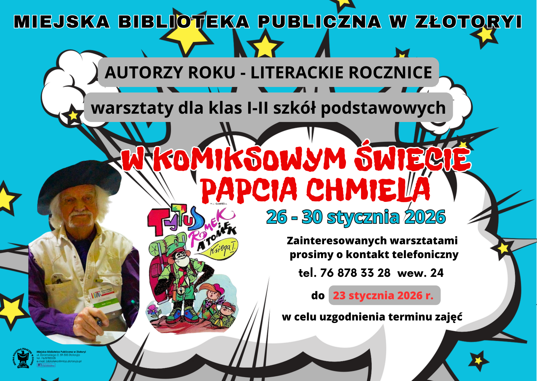 W tym miesiącu zajęcia poświęcone będą twórczości Henryka Jerzego Chmielewskiego, czyli popularnego Papcia Chmiela – twórcy komiksów z serii „Tytus, Romek i Atomek”. Szczegóły na plakacie.