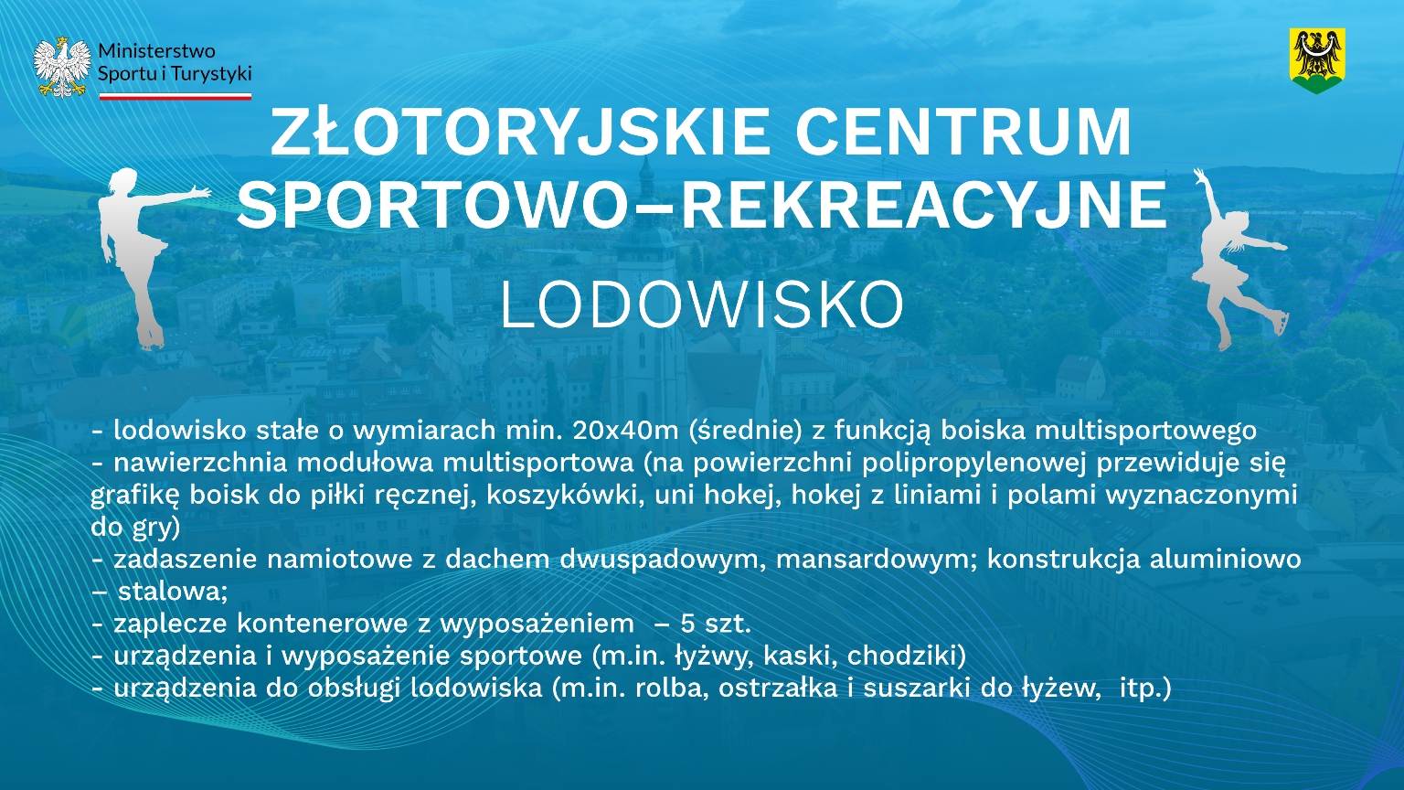 Samo zadaszone lodowisko ma kosztować ok. 5,8 mln zł. Będzie drugim elementem kompleksu sportowego u zbiegu ulic Hożej i Lubelskiej. Pierwszy to park tenisowy z krytymi kortami. Ratusz szuka już wykonawcy, który zbuduje obiekt dla tenisistów i amatorów padla. Park uzyskał 1,5 mln zł dofinansowania od marszałka Dolnego Śląska, ale miasto złożyło wniosek do MSiT o dodatkowe środki potrzebne do jego utworzenia. Władze Złotoryi czekają też na rozstrzygnięcie przez MSiT naboru w programie boisk piłkarskich ze sztuczną nawierzchnią – w tym wypadku ratusz stara się o 4 mln zł.
