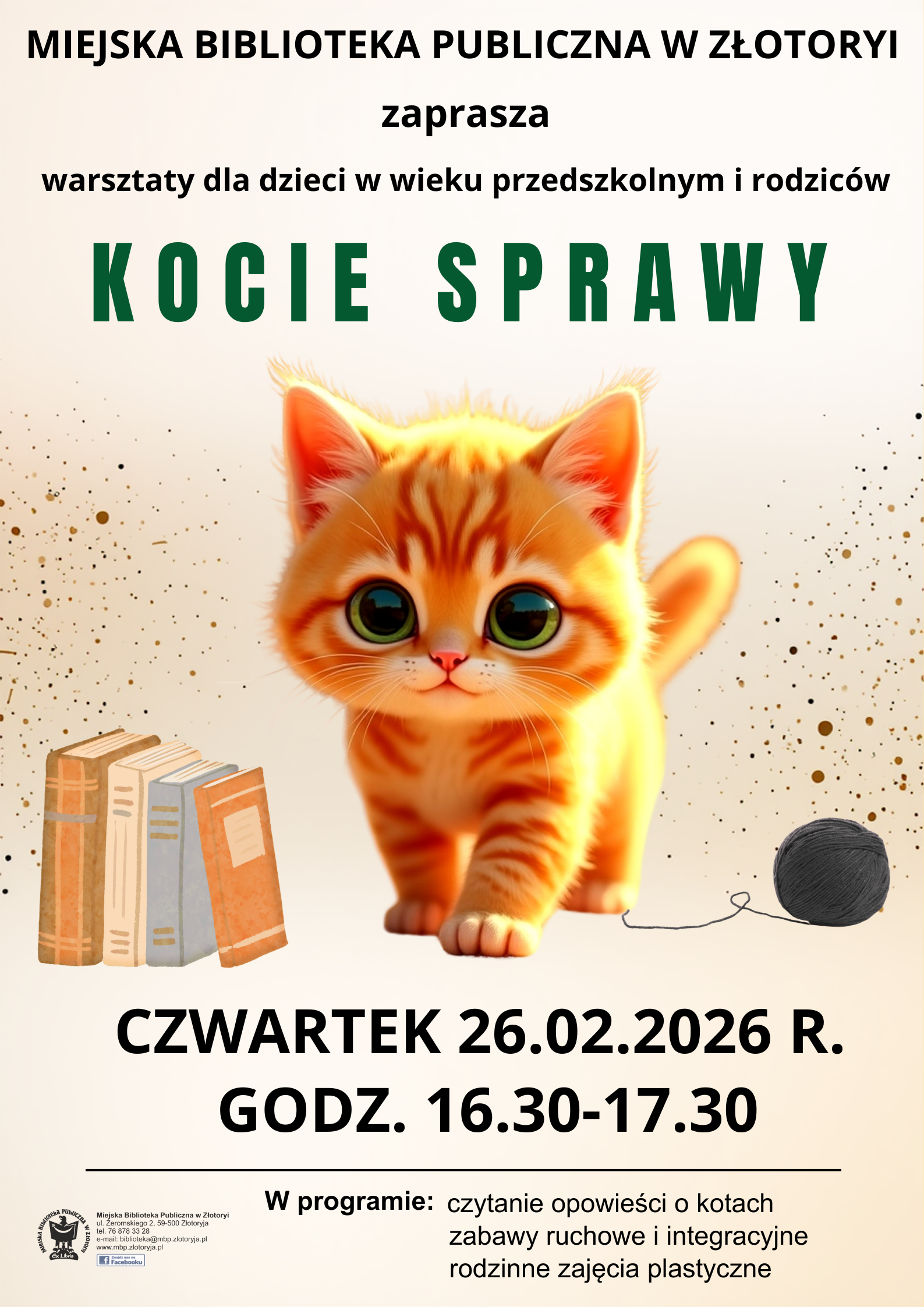 Miejska Biblioteka Publiczna zaprasza dzieci w wieku przedszkolnym z rodzicami na wyjątkowe warsztaty czytelniczo-plastyczne, gdzie czeka na nie porcja kociej radości, kreatywnej zabawy i literackich przygód.