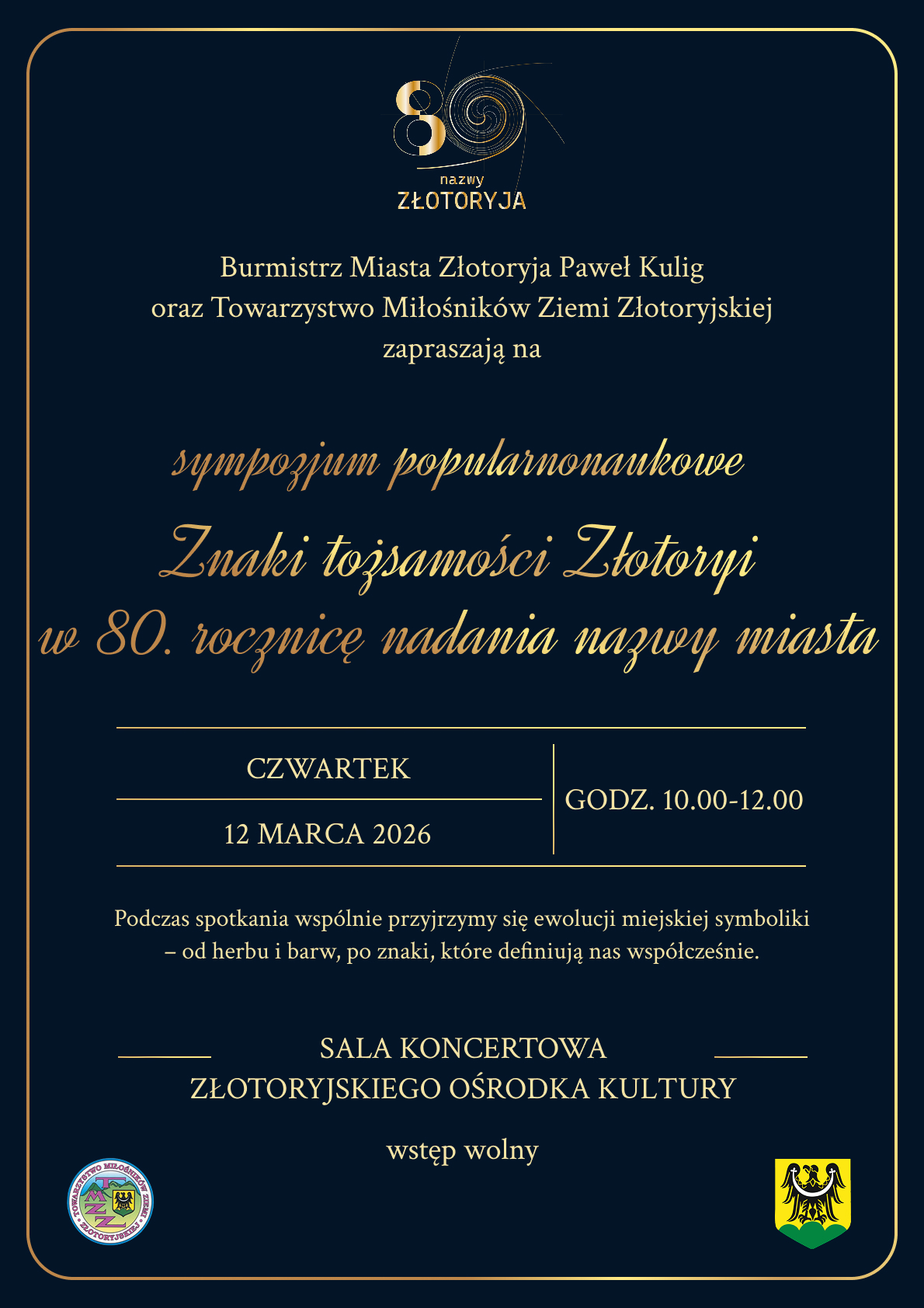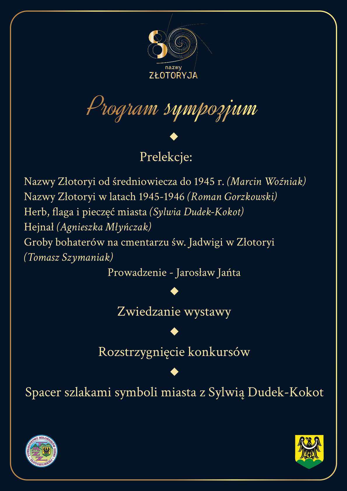Podczas sympozjum Marcin Woźniak wygłosi prelekcję o nazwach Złotoryi od średniowiecza do 1945 r., Roman Gorzkowski mówić będzie o tym, jak zmieniało się nazewnictwo miasta w latach 1945-1946, Sylwia Dudek-Kokot opowie o herbie, fladze i pieczęciach Złotoryi, Agnieszka Młyńczak o hejnale, a Tomasz Szymaniak o grobach bohaterów na złotoryjskim cmentarzu. Z kolei zaraz po konferencji odbędzie się spacer w poszukiwaniu miejsc na terenie złotoryjskiej starówki, gdzie można zobaczyć np. stare wizerunki herbu.