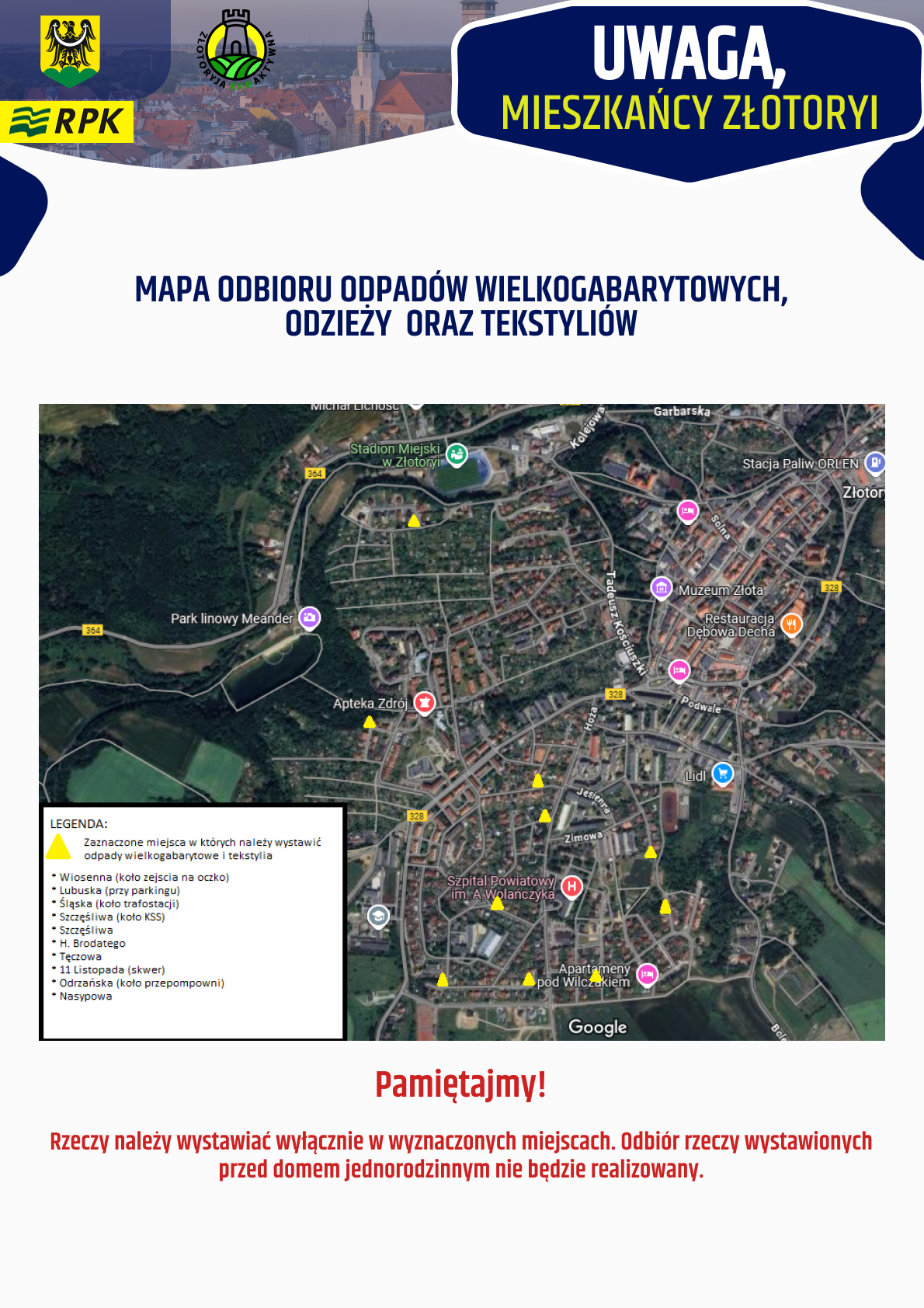 Zbiórka to okazja, żeby pozbyć się niepotrzebnych rzeczy w odpowiedzialny sposób, bez zaśmiecania miasta. Na zlecenie Urzędu Miejskiego w Złotoryi przeprowadzi ją RPK. Zaplanowana jest na czwartek i piątek 19 i 20 marca. W pierwszy dzień odpady będą zbierane w górnej części miasta, w drugi – w dolnej.