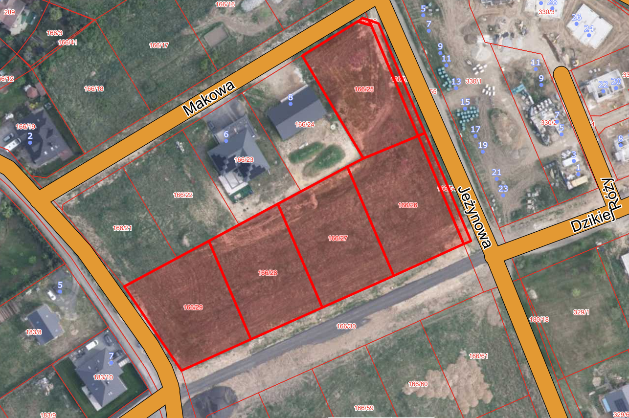 Do działek jest dość dobry dojazd wybudowaną w 2024 r. ul. Andersa. Nie ma też problemu, jeśli chodzi o uzbrojenie – sieci wodna, kanalizacji sanitarnej i elektryczna biegną przy granicy parceli, natomiast gaz dostępny jest w ul. Miodowej (projektowany jest też gazociąg w ul. Jeżynowej).