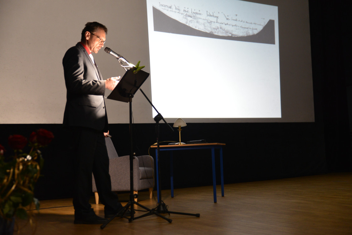 Prelegentami byli też Marcin Woźniak i Tomasz Szymaniak. Ten pierwszy mówił o trzech pierwszych nazwach naszego miasta: dwóch łacińskich – Aurum i Aureus Mons – oraz tej niemieckiej, Goldberg. – to, co najbardziej wyróżnia każdą osadę, to nazwa, utrwalona przez lata lub wieki, zapisana w ludzkiej świadomości i pamięci. Nazwa naszego miasta była zawsze związana z tym, co ponoć jest najcenniejsze w życiu doczesnego człowieka, czyli dostatkiem i majątkiem. Najprościej mówiąc – złotem – wyjaśniał Woźniak (na dole, po lewej).