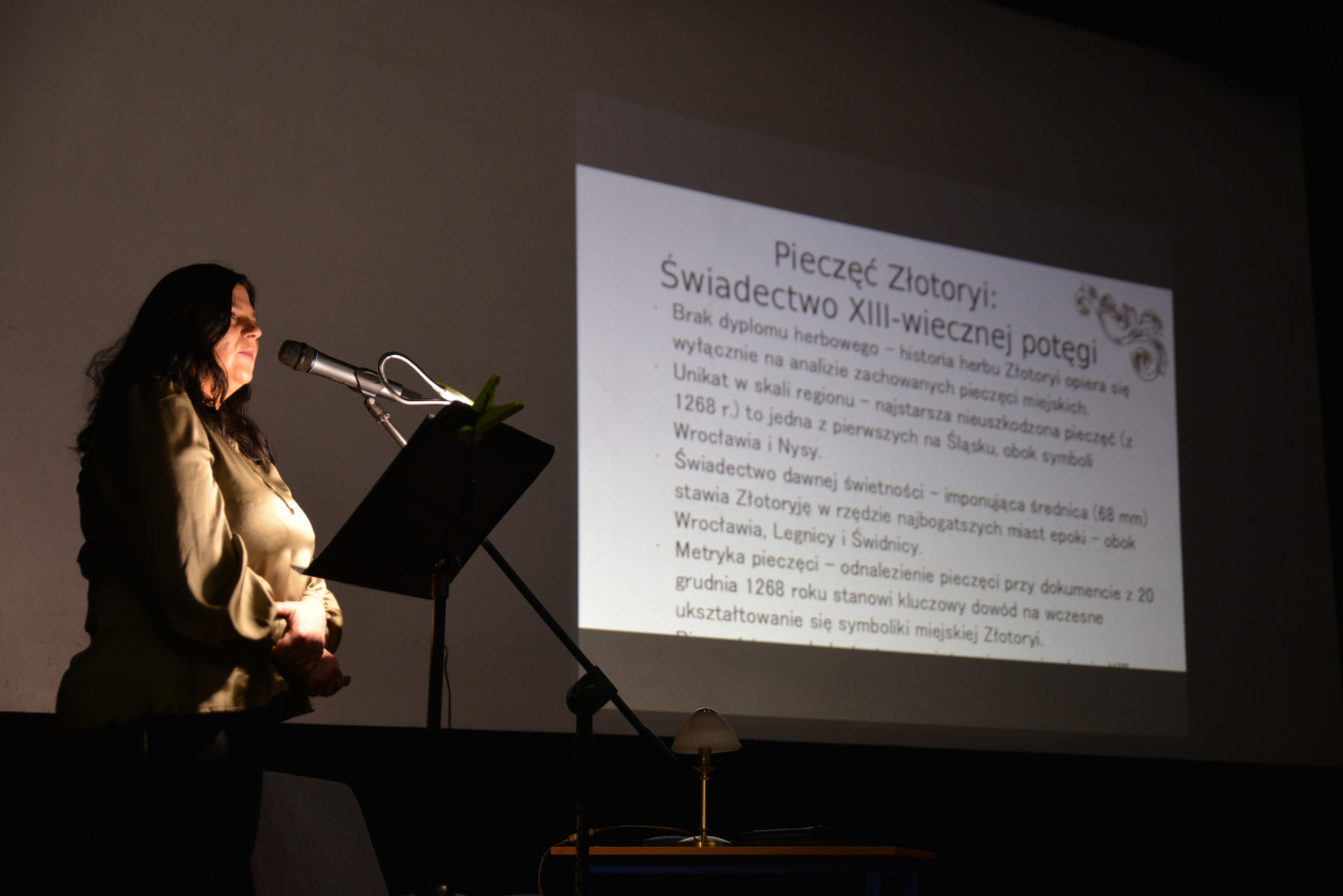 Najstarsza znana pieczęć Złotoryi pochodzi z 1268 r. Miała 68 mm średnicy , była więc dość duża, biorąc pod uwagę, że pieczęcie z tamtego okresu miały od 80 do 30 mm. – Była bardzo dokładna i imponującej wielkości, co świadczy o tym, że Złotoryja była wtedy bogatym miastem, z aspiracjami. To jedna z najstarszych pieczęci obok symboli Wrocławia i Nysy – zauważyła prelegentka.