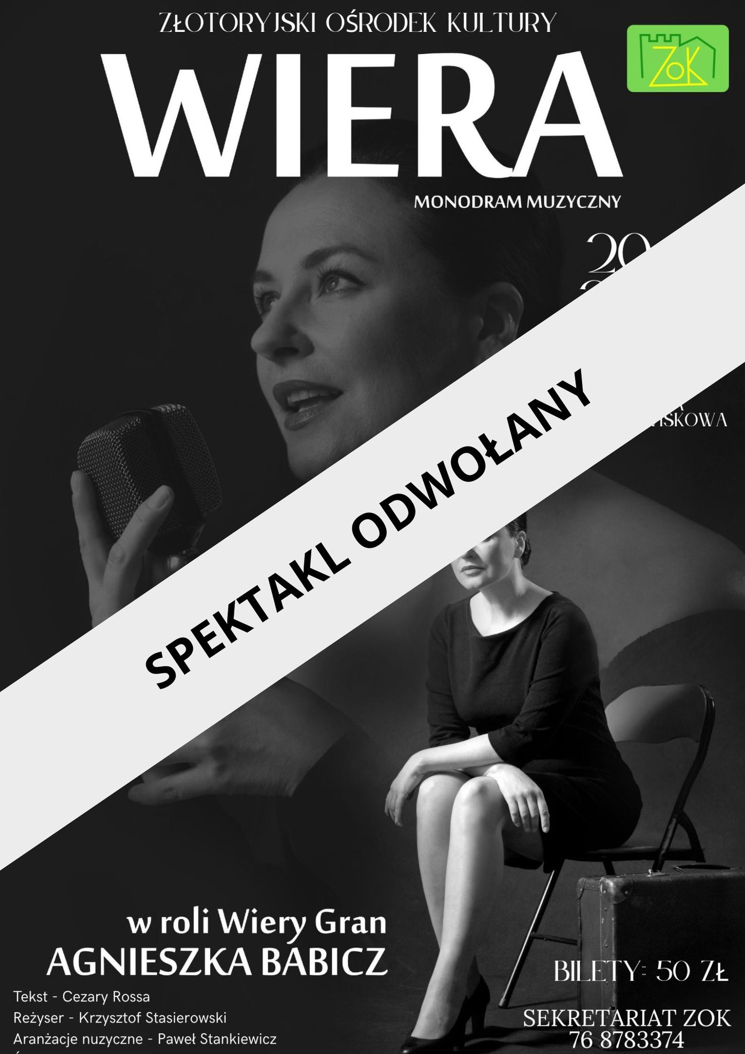 „Wiera” odwołanaInformujemy, że monodram muzyczny „Wiera”, który miał odbyć się 20 listopada br. został odwołany. Osoby, które nabyły bilety prosimy o skontaktowanie się z sekretariatem Złotoryjskiego Ośrodka Kultury.