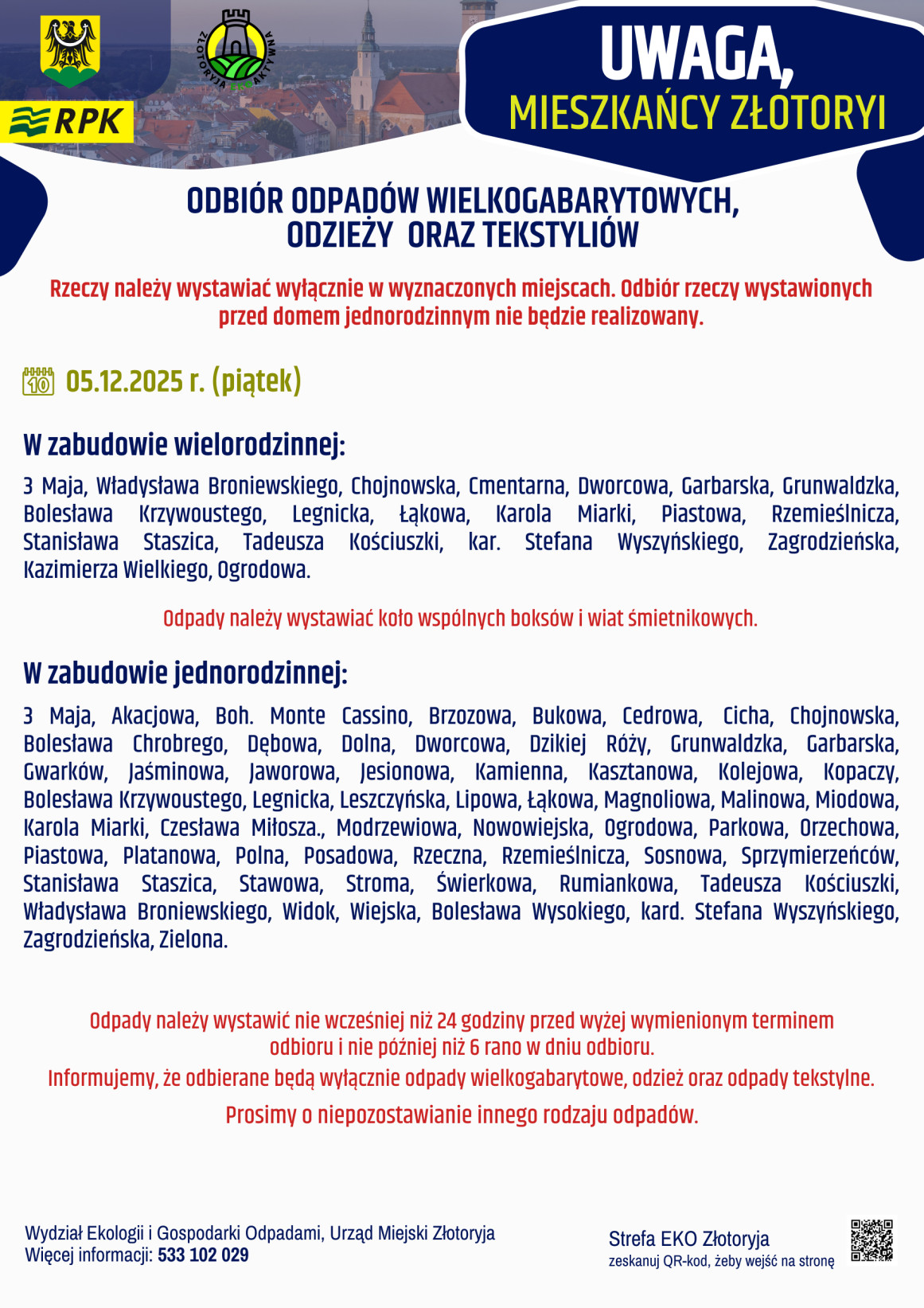 Jeśli ktoś zamierza skorzystać z udogodnienia wprowadzonego przez złotoryjski magistrat, musi się wstrzymać z wyniesieniem z domu odpadów tekstylnych i wielkogabarytowych do środy i czwartku 3 i 4 grudnia – inaczej będzie to traktowane przez służby komunalne jak zaśmiecanie miasta. Zgodnie z zasadami – przypomnijmy – śmieci należy wystawić nie wcześniej niż 24 godziny przed terminem zbiórki na danej ulicy i nie później niż o godz. 6 w dniu odbioru. I – dodajmy – trzeba to zrobić w ściśle określonym miejscu.