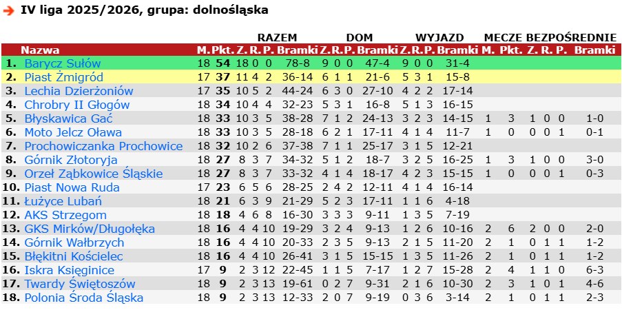 Barycz Sułów, z dorobkiem 54 punktów, zajmuje pierwsze miejsce w tabeli 4. ligi dolnośląskiej.