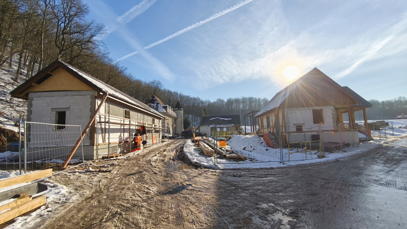 Dziś budowlańcy zaczęli wstawiać w budynkach centrum stolarkę okienną. Równolegle prowadzone są prace wykończeniowe przy elewacjach, na których montowane są drewniane elementy imitujące konstrukcję szachulcową charakterystyczną dla zabudowy Pogórza Kaczawskiego. Roboty nie brakuje także wewnątrz posadowionych na żelbetowych palach obiektów, gdzie stawiane są m.in. ścianki działowe.