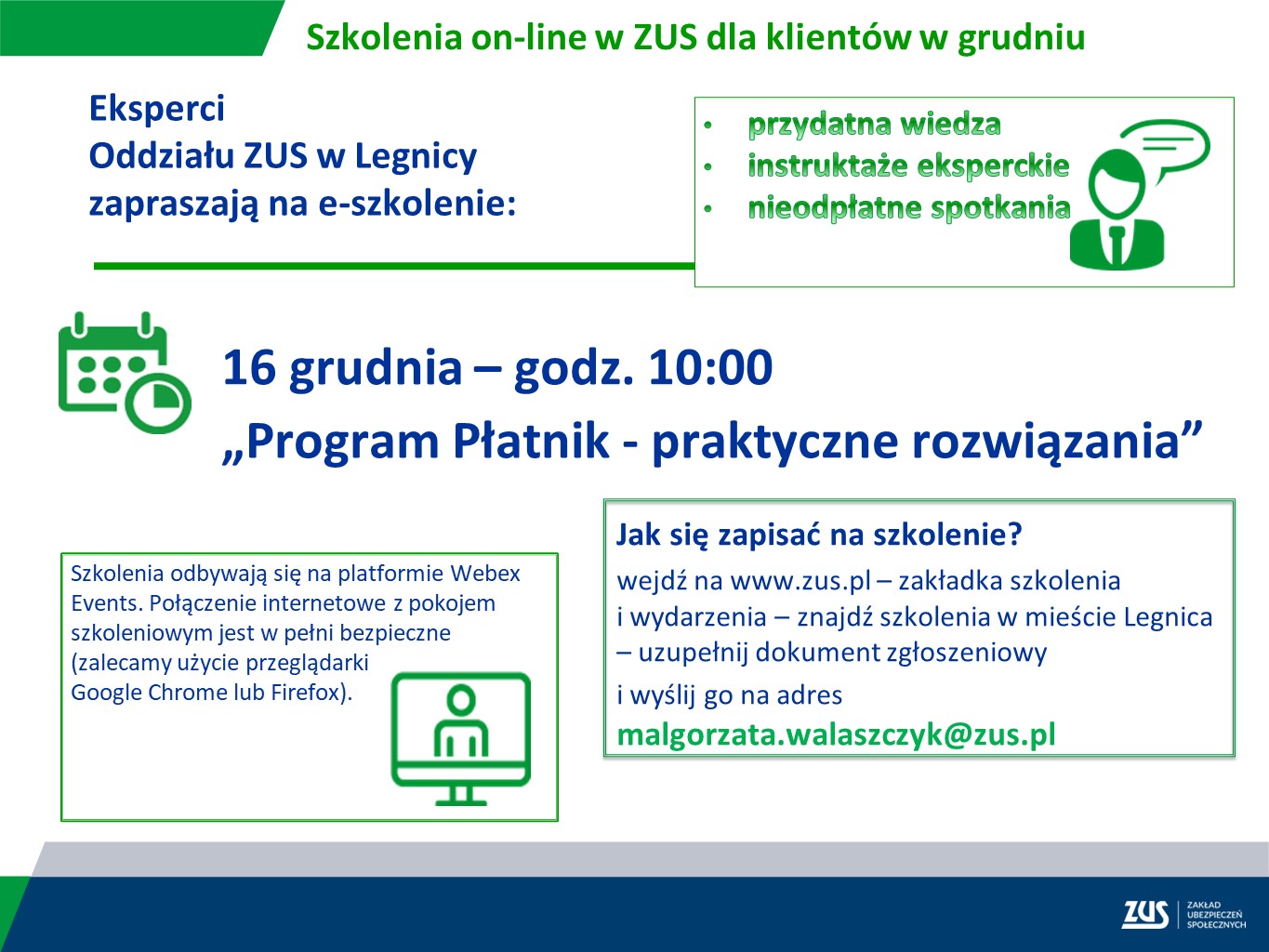 Szkolenie z programu Płatnik16 grudnia ZUS przeprowadzi szkolenie on-line pn. „Program Płatnik - praktyczne rozwiązania”. Szkolenie poprowadzi: Małgorzata Sokołowska, ekspertka z legnickiego Oddziału ZUS. Więcej informacji TUTAJ.