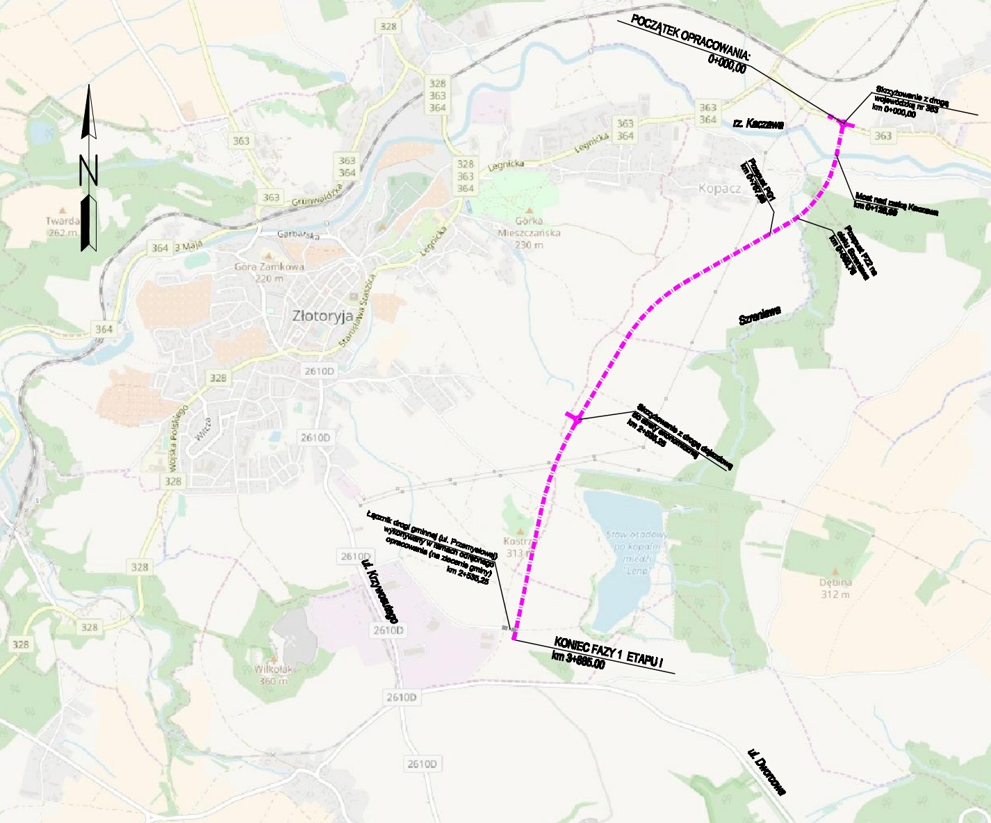 Pierwsza część obwodnicy będzie liczyła 3 km 885 m. Jej początek wyznaczono na skrzyżowaniu z drogą wojewódzką 363 ze Złotoryi do Jawora, a koniec przy strefie ekonomicznej, na wysokości ul. Przemysłowej.