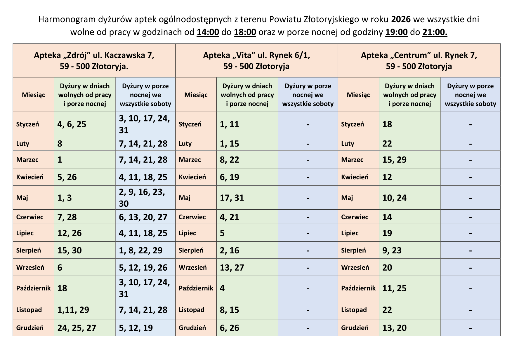 Znamy harmonogram dyżurów ogólnodostępnych aptek z terenu powiatu złotoryjskiego na 2026 rok.