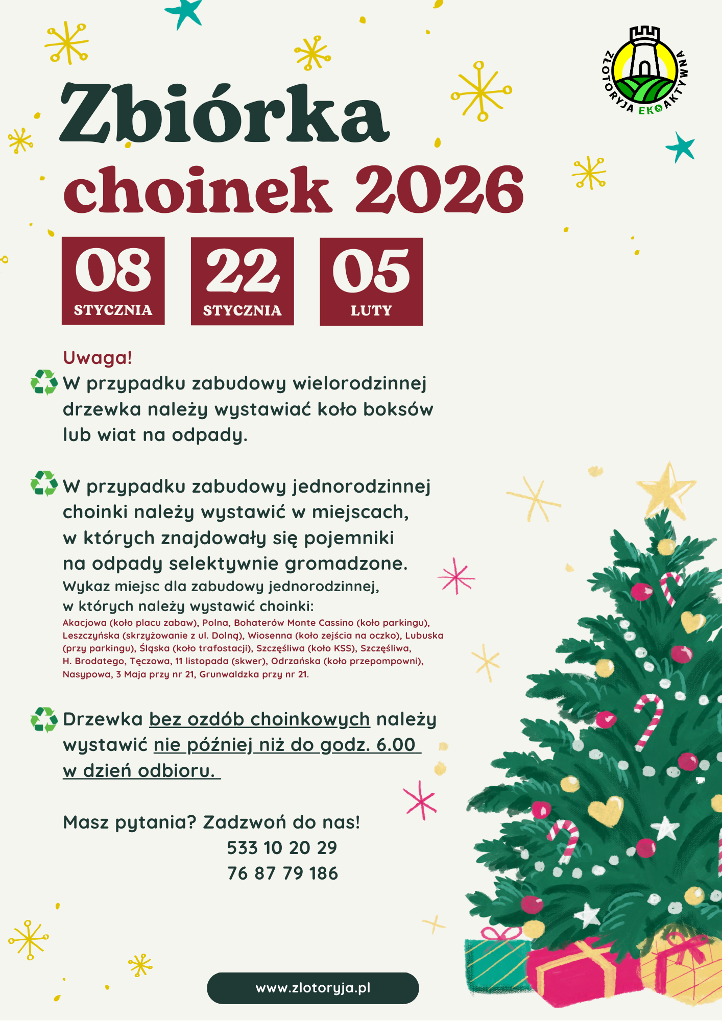 Urząd Miejski w Złotoryi przeprowadzi w tym i kolejnym miesiącu 3 akcje, w czasie których mieszkańcy będą mogli się pozbyć niepotrzebnych już drzewek świątecznych. Pierwsza z nich odbędzie się w czwartek 8 stycznia, następna 22 stycznia, a ostatnia 5 lutego.