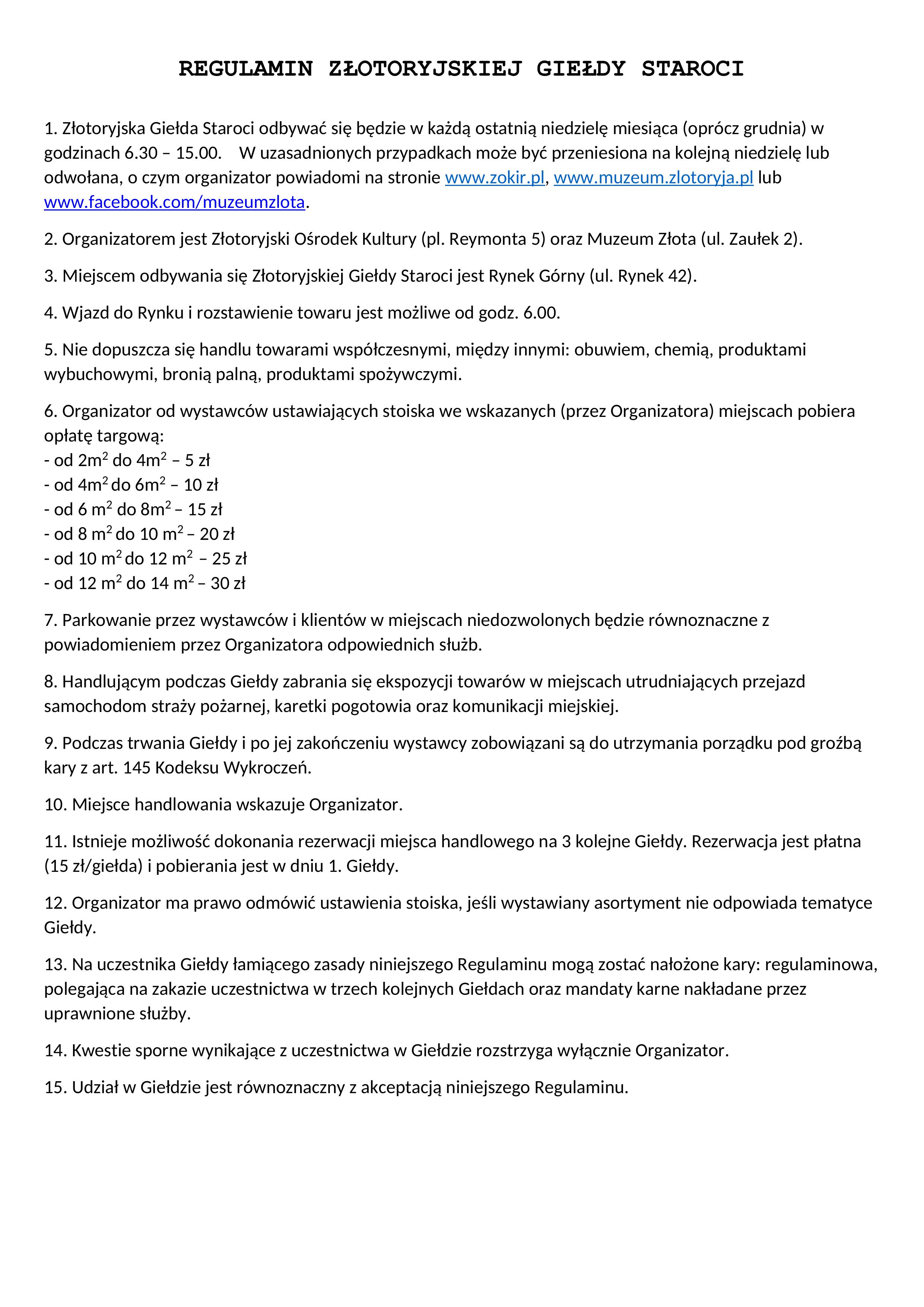 W uzasadnionych przypadkach może być przeniesiona na kolejną niedzielę lub odwołana, o czym organizator powiadomi na stronie www.zokir.pl, www.muzeum.zlotoryja.pl lub www.facebook.com/muzeumzlota.