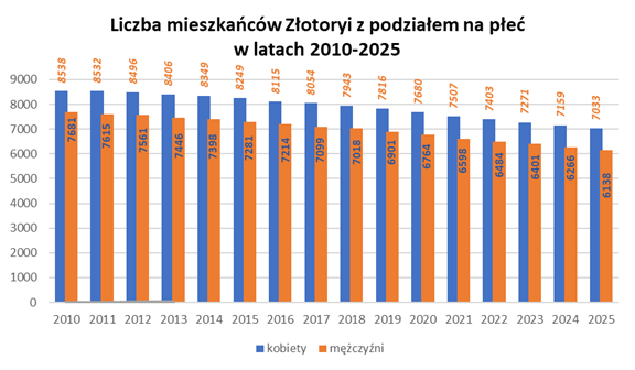 Przez 15 lat, od roku 2010, ludność Złotoryi zmniejszyła się o 2 tys. osób. Przy utrzymaniu tych niekorzystnych trendów demograficznych w drugiej połowie 2026 liczba złotoryjan spadnie poniżej 13 tys.