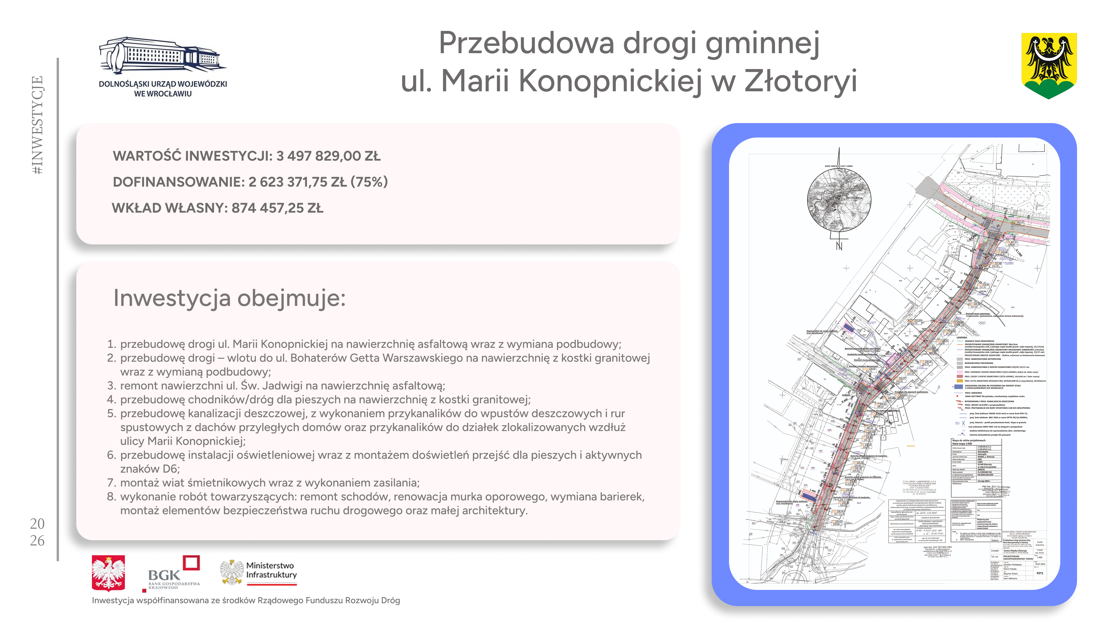 Złotoryjski ratusz nie zatrzymuje się, jeśli chodzi o przebudowę miejskich dróg. Na horyzoncie jest kolejna wskazywana od lat przez mieszkańców inwestycja – na ulicy Marii Konopnickiej. Sfinansowana będzie w głównej mierze ze środków rządowych, o czym poinformował dziś podczas konferencji prasowej wicewojewoda Artur Jurkowski. – Przekażemy dofinansowanie na poziomie aż 75 proc. kosztów całego przedsięwzięcia – zapewnił przedstawiciel rządu na Dolnym Śląsku.
