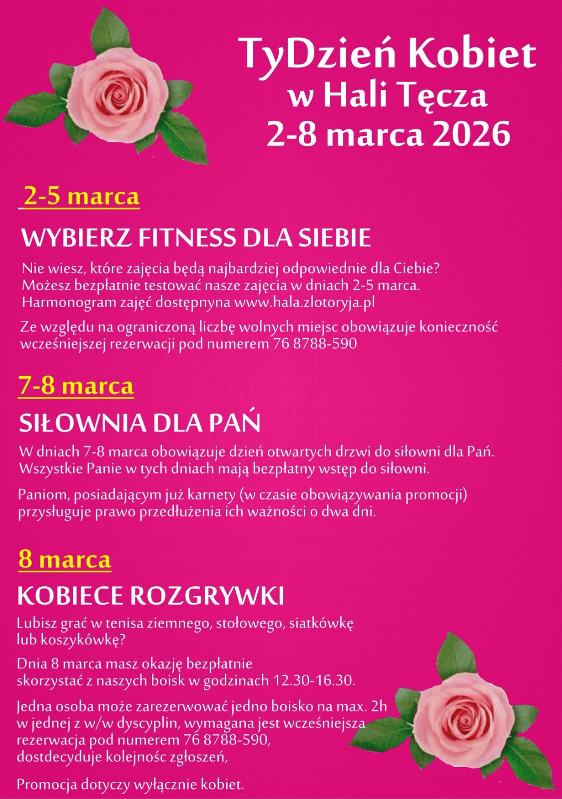 W Złotoryi Dzień Kobiet zaczął się już wczoraj. Hala Tęcza zaprasza na testowanie zajęć fitness – od 2 marca aż do 5 marca panie mają wolny wstęp na zajęcia (harmonogram zajęć dostępny jest na stronie www.hala.zlotoryja.pl, obowiązuje rezerwacja pod numerem tel. 76 878 85 90). Z kolei 7 i 8 marca można skorzystać bezpłatnie z siłowni klubu. W najbliższą niedzielę zaplanowane są też kobiece rozgrywki klubowe.