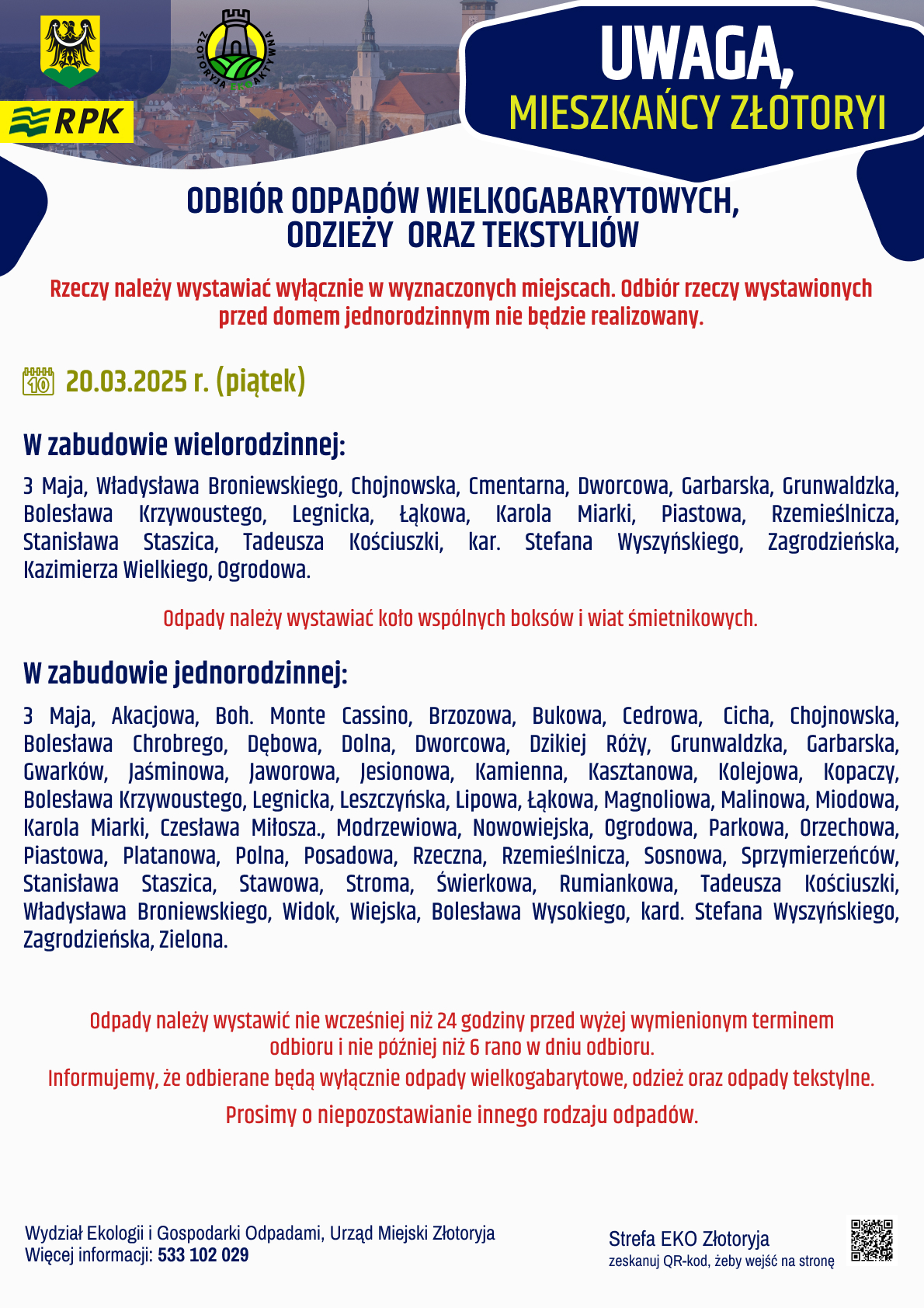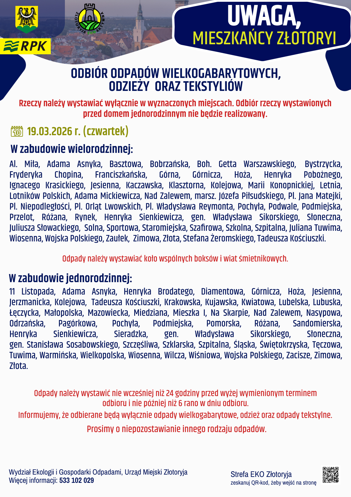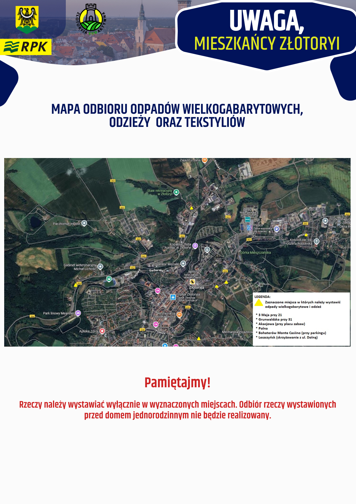Zbiórka to okazja, żeby pozbyć się niepotrzebnych rzeczy w odpowiedzialny sposób, bez zaśmiecania miasta. Na zlecenie Urzędu Miejskiego w Złotoryi przeprowadzi ją RPK. Zaplanowana jest na czwartek i piątek 19 i 20 marca. W pierwszy dzień odpady będą zbierane w górnej części miasta, w drugi – w dolnej.