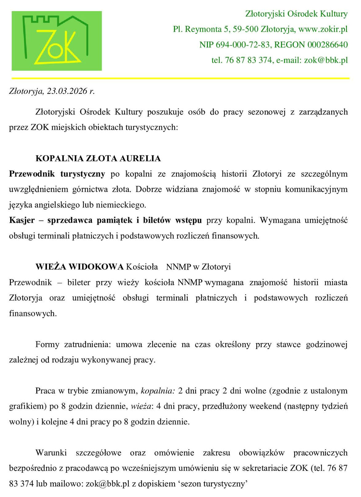 Złotoryjski Ośrodek Kultury poszukuje pracowników do Kopalni Złota i wieży widokowej kościoła NNMP.